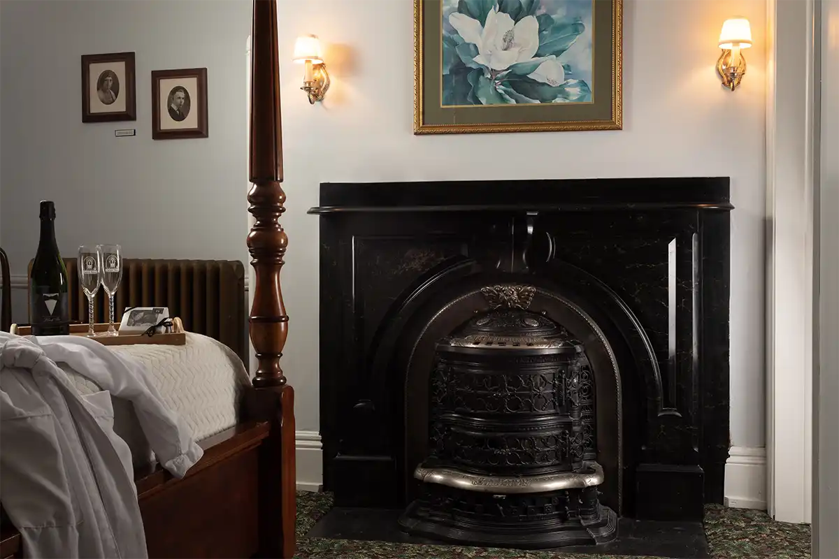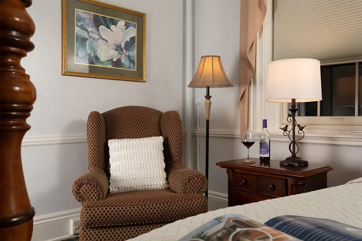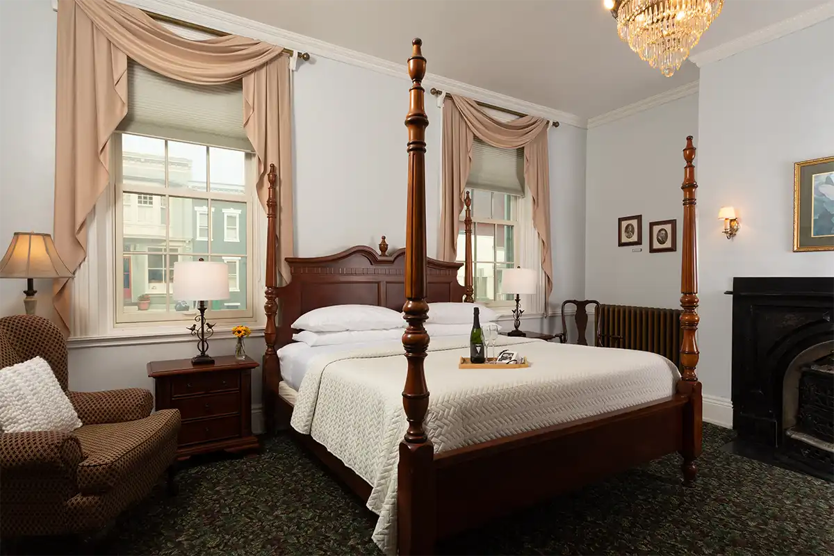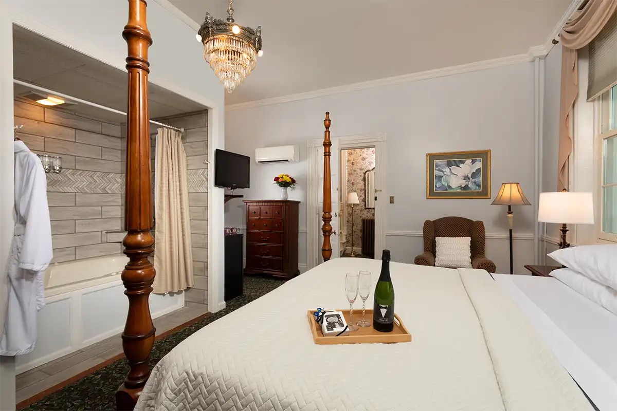 For your comfort, this front room has been equipped with a burl wood two-poster king bed and wifi.