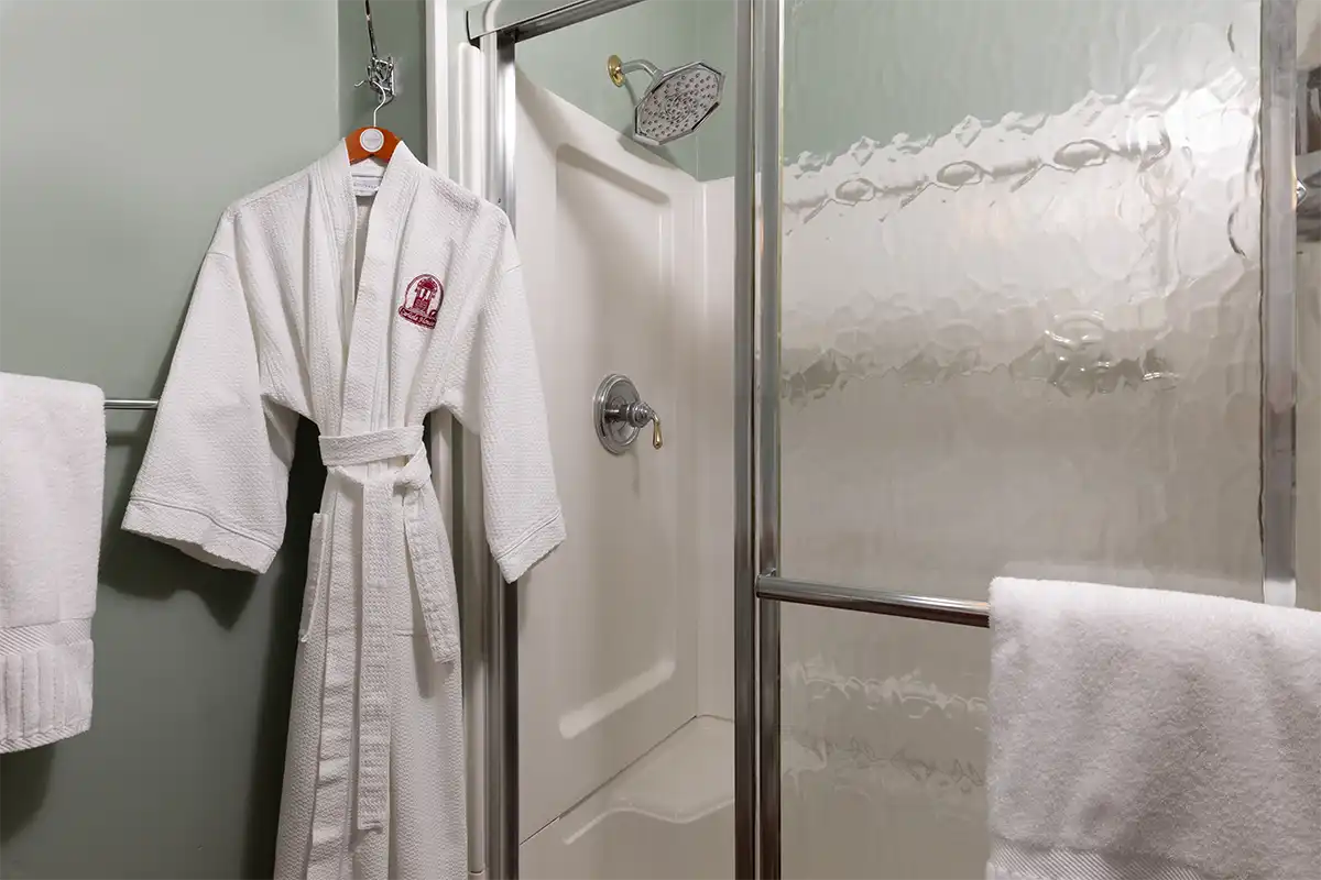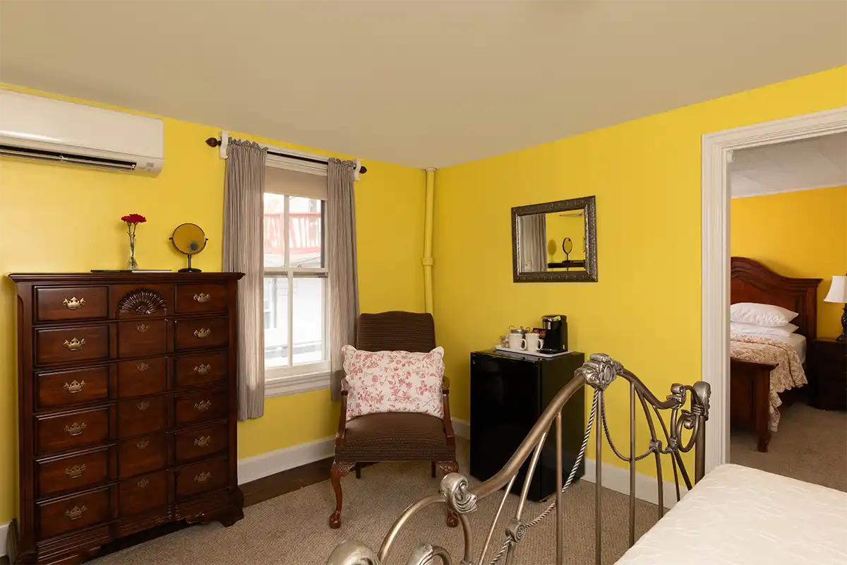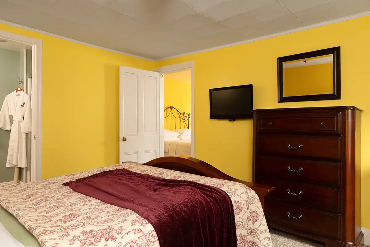 The Hayes Suite, is located on the 2nd floor at the rear. Hayes has two cozy bedrooms with a connecting door, and a private bathroom with large enclosed shower with corner seat, and European-style vanity. Each room has a TV.