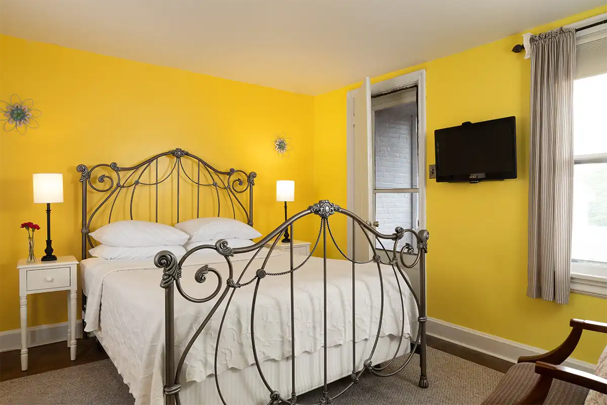 The adjacent cheery yellow bedroom features a fluted iron queen bed with decadent bedding and tan carpet giving a luxurious sunny glow to the room.