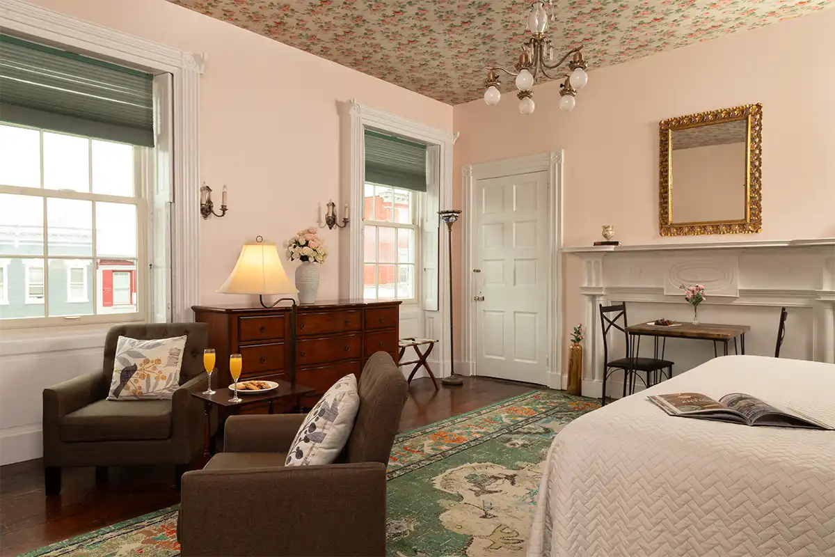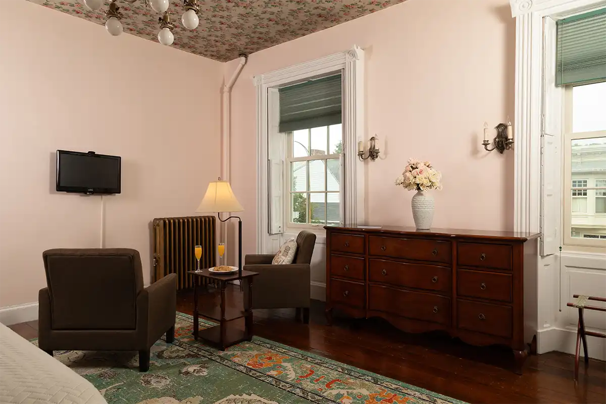 The spacious front bedroom on the 2nd floor features a king bed. A sitting area with two easy chairs provides a comfortable place for reading, conversation, or watching TV.