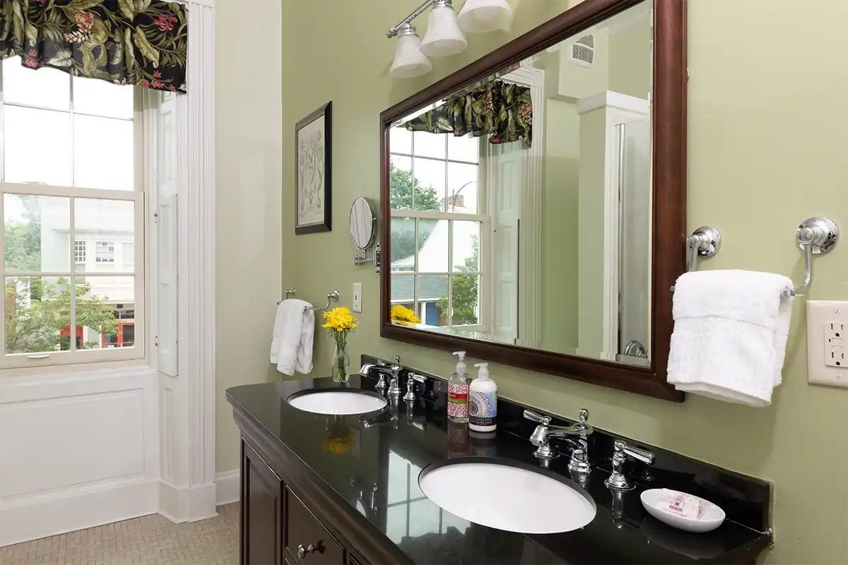Once the bedroom of the Ewing twins, whose family arrived in Carlisle in 1849, it was papered with the present rose design in the 1930s when the boys were in grade school. The wide plank yellow pine floorboards highlight the scrollwork on the King bed. A unique feature are the original pocket-shutters, which fold back into the window frame.
